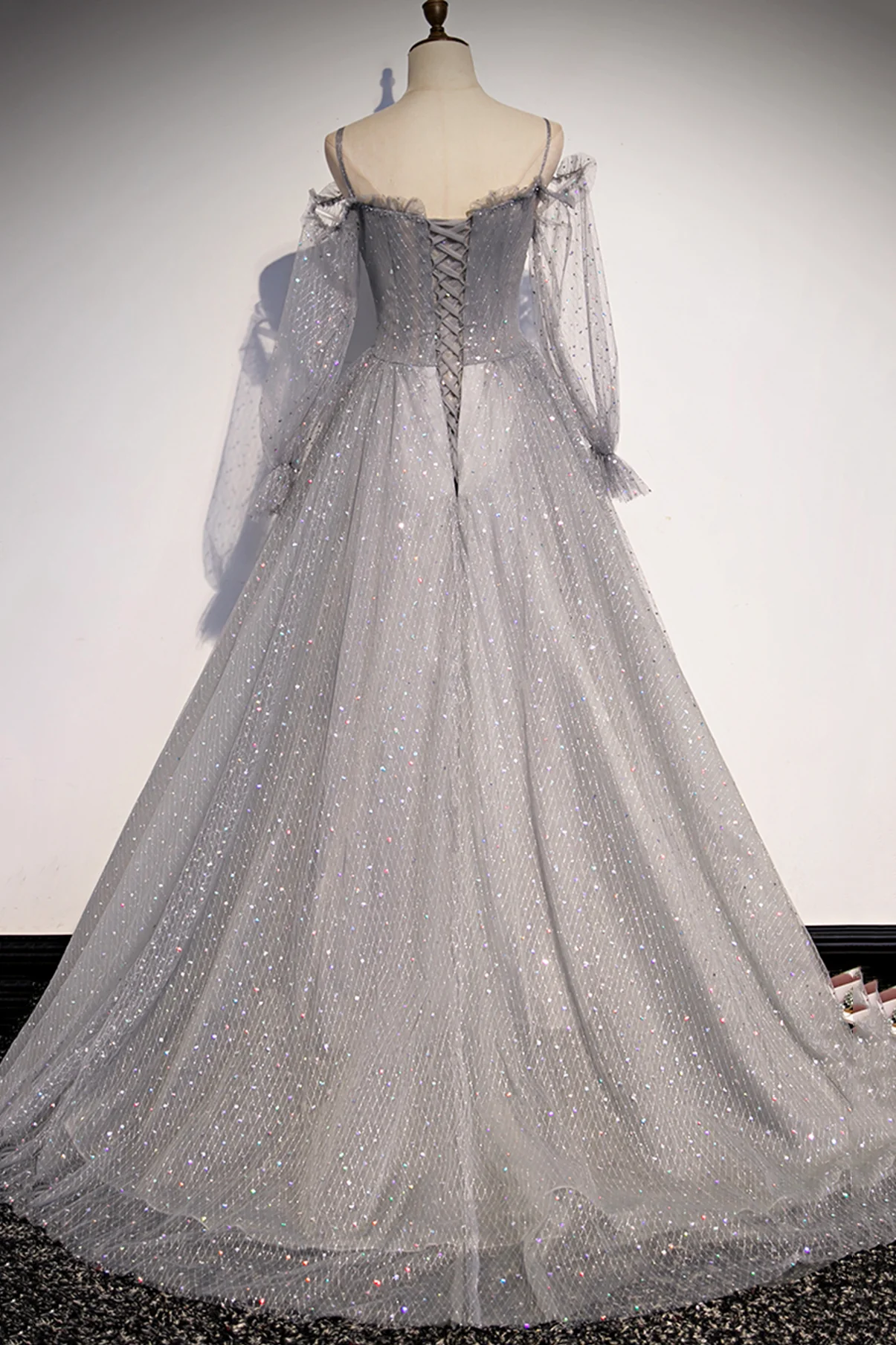 GRAY TULLE SEQUINS LONG A LINE PROM DRESS EVENING DRESS fg2251